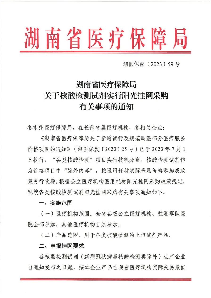2023年8月16日,湖南省醫(yī)保局發(fā)布《關(guān)于核酸檢測(cè)試劑實(shí)行陽(yáng)光掛網(wǎng)采購(gòu)有關(guān)事項(xiàng)的通知》,要求相關(guān)生產(chǎn)企業(yè)將用于各類核酸檢測(cè)的上市試劑產(chǎn)品(新型冠狀病毒核酸檢測(cè)類除外)于2023年9月10日前,以湖南省醫(yī)療機(jī)構(gòu)實(shí)際交易最低價(jià)在湖南醫(yī)保招采管理系統(tǒng)申報(bào)掛網(wǎng)。