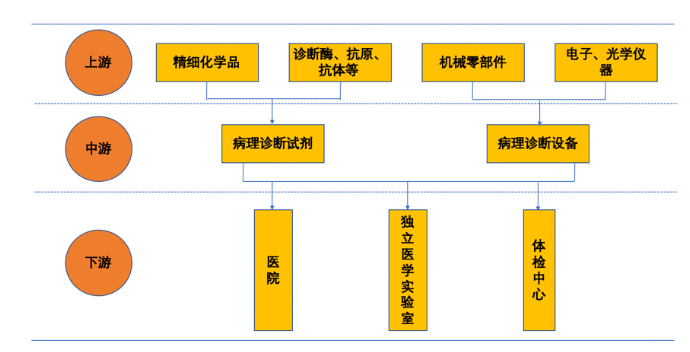 病理行業(yè)產(chǎn)業(yè)鏈包括上游原料市場、中游試劑設(shè)備市場和下游需求診斷市場。原料包括生物與化學(xué)原材料以及各種機械零配件,分子病理還會涉及到引物、探針等;中游包括病理診斷試劑和病理診斷儀器;下游需求主要來自于醫(yī)院、第三方獨立醫(yī)學(xué)實驗室、體檢中心、政府等。