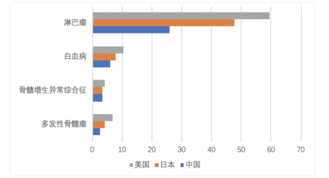 根據(jù)上圖所示,多發(fā)性骨髓瘤在中國、日本、美國的發(fā)病率分別為2.5/100000,4.4/100000,6.7/100000;骨髓增生異常綜合癥在中國、日本、美國的發(fā)病率3.4/100000,3.5/100000,4.2/100000;白血病在中國、日本、美國的發(fā)病率分別為6.1/100000,7.8/100000,10.6/100000;淋巴瘤在中國、日本、美國的發(fā)病率分別為25.9/100000,47.6/100000,59.4/100000。由此可見2008年-2015年的四種血液腫瘤發(fā)病率呈現(xiàn)逐年上升的趨勢,其中淋巴瘤發(fā)病率最高,平均高達(dá)44.3。