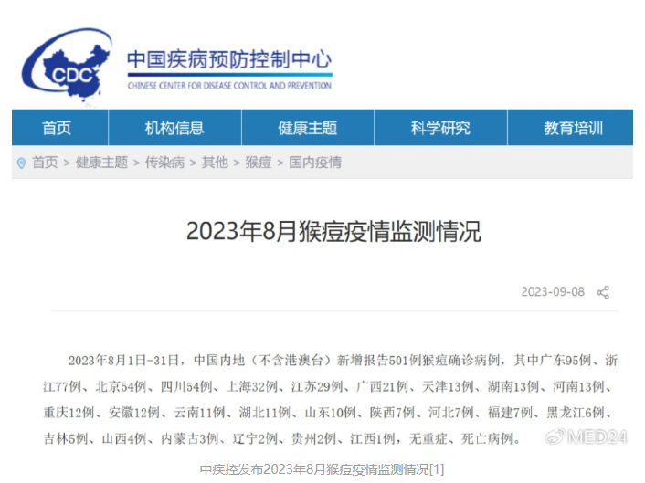 9月8日,中疾控發(fā)布8月猴痘疫情監(jiān)測(cè)情況[1]。2023年8月1日-31日,中國(guó)內(nèi)地(不含港澳臺(tái))新增報(bào)告501例猴痘確診病例,相較7月增加10例。
